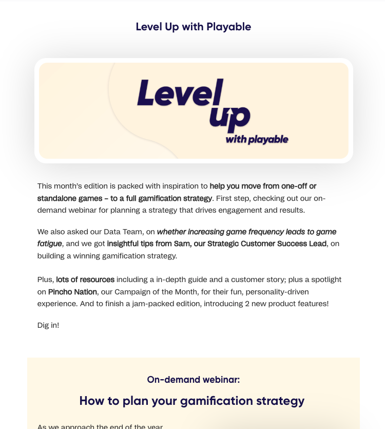 Level Up is our monthly customer communication – designed to inspire and motivate you to get the most out of the Playable gamification platform and assist you in creating successful and engaging campaigns.